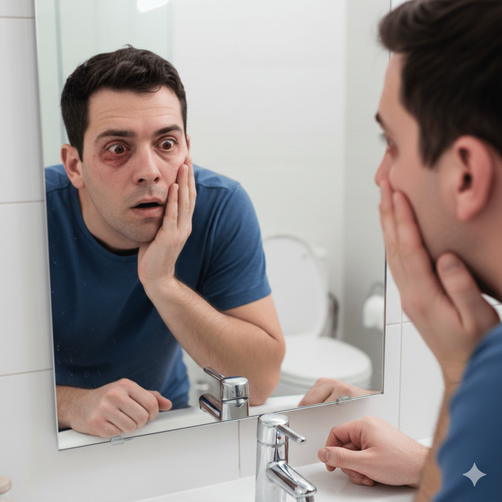 トイレに入り鏡を見ると自分の目はまあ充血。でも血が眼球表面にでているとかはなかった。