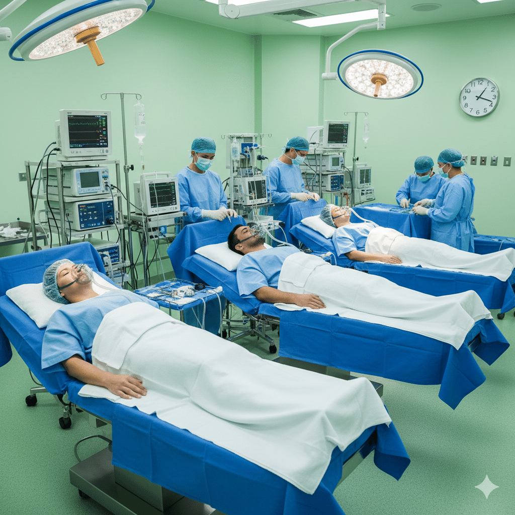 番号札〇番の方と呼ばれたら順番に3人ずつ3台ある手術台に寝転がり